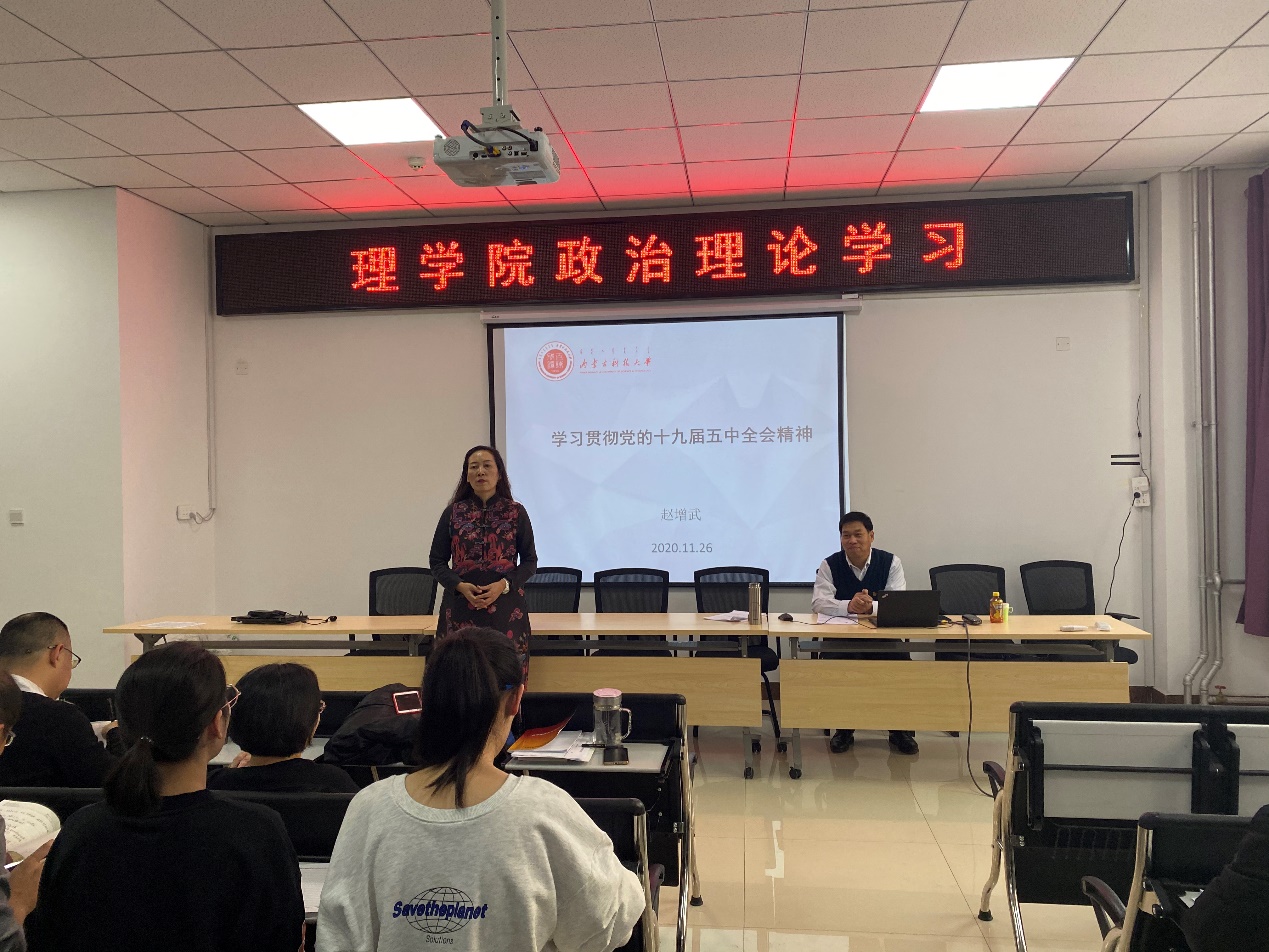 1126日下午2:30,在明德楼E205会议室,太阳成集团tyc539党委委员、副校长赵增武教授为太阳集团tyc539全体教师和学生党员作党的十九届五中全会精神宣讲报告。