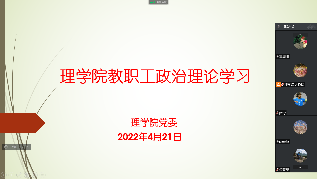 4月21日下午14点30分,太阳集团tyc539通过腾讯会议平台召开线上教职工政治理论学习会议,学院全体教职工参加了本次学习,学习会由院党委书记杨晓玲主持。