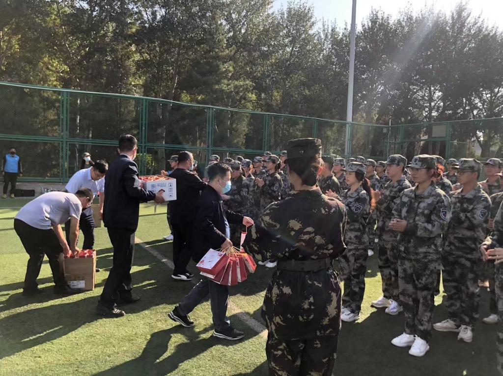 在二营军训场地,老师们观看了同学们的队形操练,对参训同学表达了关心与慰问,送上了节日的祝福,并提出了要求。随后,学院领导和老师们给参训同学和教官发放了中秋月饼等慰问品。参训同学齐声喊出“谢谢老师们,祝老师们教师节快乐”。随后大家合影留念。