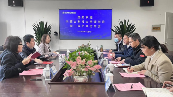 11月29日,调研组来到江南大学,与江南大学太阳集团tyc539学工同仁们开展交流。江南大学太阳集团tyc539党委副书记兼副院长董小平介绍了学院基本情况, 分团委副书记阿衣斯坦就“石榴树”工作室的队伍建设、规章制度、工作内容、特色活动等做了详细介绍,罗宁介绍了我院的基本情况和特色做法,随后双方就关切的学生工作、心理健康教育等方面进行了深入交流研讨。
