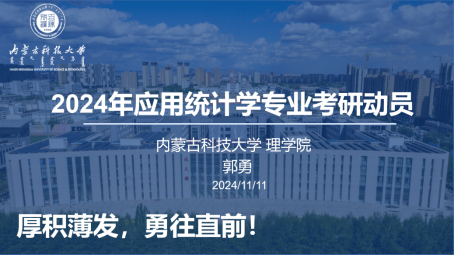 会上,郭勇老师详细介绍了近5年应用统计学专业的考研形势,强调了考研对于深入学习专业知识、拓宽就业渠道的重要性。通过分析历年关于报考人数、学硕和专硕分数线以及报考方向等相关数据,让同学们清晰地了解到本专业的考研录取情况和趋势。同时,也分享了自己的备考经验和心得,从复习方法、时间安排到心态调整,为学生们提供了宝贵的经验。此次考研动员会有助于激发应用统计学专业学生的考研热情,相信在接下来的学习中,同学们将以更加坚定的信心,为实现自己的考研梦想而努力奋斗。愿考研的同学们,路遥而不坠其志,行远而不改初衷,终成所愿,一研为定!