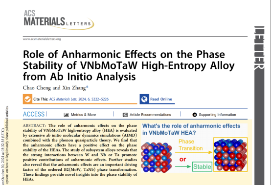 近日,《ACS Materials Letters》(中科院1区,影响因子9.6)刊发了我院程超老师的学术论文“Role of Anharmonic Effects on the Phase Stability of VNbMoTaW High-Entropy Alloy from Ab Initio Analysis”,程超老师为该论文第一作者。该研究课题得到了内蒙古自然科学基金青年基金项目、内蒙古自治区直属高校基本科研业务费项目和内蒙古自治区引入高层次人才项目的支持。