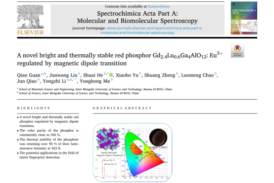 今年,我院管倩老师在《Spectrochimica Acta Part A: Molecular and Biomolecular Spectroscopy》(中科院2区,影响因子4.6)刊发了学术论文《A novel bright and thermally stable red phosphor Gd2.4Lu0.6Ga4AlO12: Eu3+ regulated by magnetic dipole transition》。该研究小组依托我校“稀土发光材料”研究平台,设计了一种新型红色荧光材料及其在光学领域的应用研究。