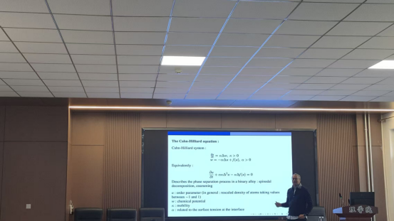 报告中,Miranville教授首先回顾了经典Cahn-Hilliard方程的物理背景,随后重点介绍了带非线性源项模型的数学研究进展,围绕解的存在性、正则性、吸引子以及分离性质等核心问题展开,并比较了多项式势与对数势两类模型的差异。对于无源项的对数势情形,在一维和二维可证明严格分离,而三维目前仅能得到弱分离;当引入源项时,若要获得严格分离与唯一性,通常需要满足额外的符号条件、分解假设以及更高的正则性要求。最后,报告展示了该类模型在图像修复、肿瘤生长及生物组织乳酸浓度等问题中的应用。