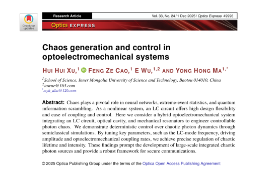 近日,物理学专业硕士研究生徐慧慧同学以第一作者身份在国际光学权威期刊《Optics Express》(中科院二区,影响因子3.3)上发表了题为“Chaos generation and control in optoelectromechanical systems”的学术论文,通讯作者为我院马永红教授。太阳集团tyc539为论文唯一单位和通讯单位。《Optics Express》是Optica Publishing Group主办的光学学术期刊之一,主要发表光学与光子学所有分支领域的高水平前沿学术成果,覆盖光学材料与器件制备技术、光学成像与传感系统开发、光纤通信及光子集成电路、量子信息处理、量子测量与传感等关键领域,是国际光学界广泛认可的享有高度学术声誉的期刊之一。