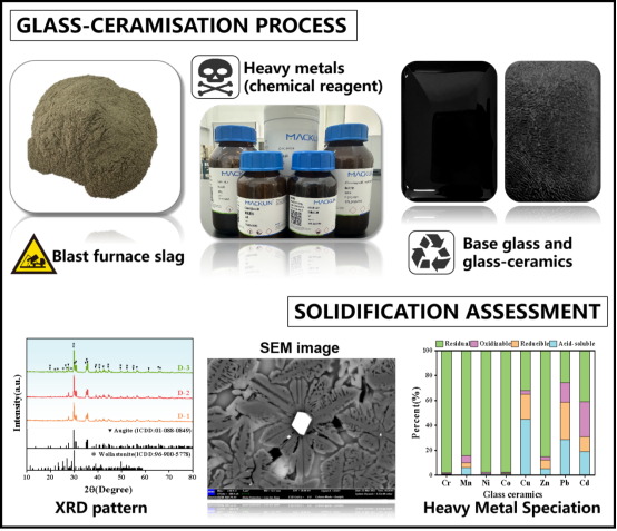 面向工业固体废弃物资源化利用与重金属污染协同治理的需求,本研究以高炉渣为主要原料,构建Cr、Mn、Ni、Co、Cu、Zn、Pb、Cd等多种重金属共存的复杂污染体系,制备多相复合微晶玻璃材料。通过多尺度表征揭示了晶体生长机制与重金属差异固化规律。微晶玻璃的晶相-玻璃相协同作用成功实现了对上述典型重金属的固化,并具备优异的理化性能。固化效果与环境安全评估显示,所有重金属的浸出浓度均低于国内外安全限值,固化效率达99.8%以上。本研究不仅为工业固废高值化利用提供了新策略,也为重金属污染物的安全处置提供了理论和技术支撑。