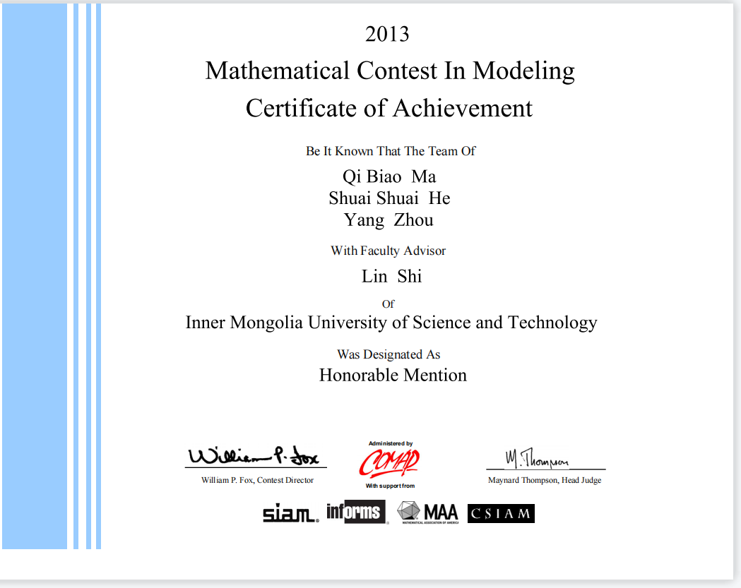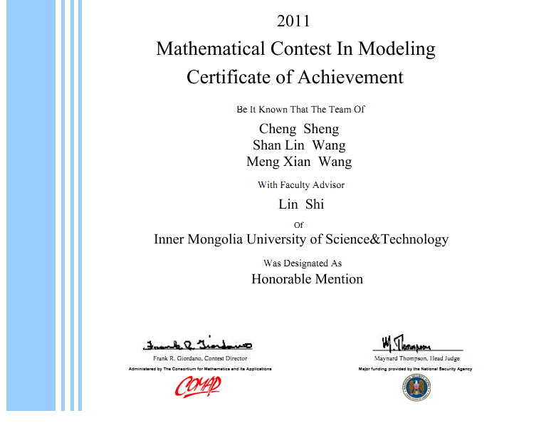 在大学生创新能力培养方面,石琳教授首次开设全校“数学建模”公选课;首次在全校开展数学建模讲座;2009年组建数学建模团队,负责《数学建模》暑期竞赛培训、校级竞赛和数学建模网络平台建设等工作。组队参加“全国大学生数学建模竞赛”;从2009年创建到2021年,参赛规模逐步扩大,建模团队从几名教师发展到全体数学教师参与,全体教师受益;通过举办一年一度的数学建模竞赛,大学生的创新能力得到锻炼,从2009年至今,学生获得多项全国大学生数学建模竞赛奖和国际大学生数学建模奖。为我校创新型人才培养作出了贡献。