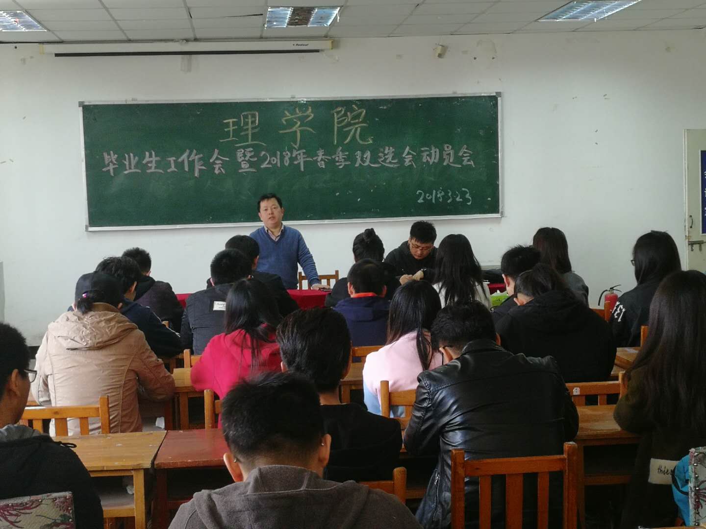 3月23日上午9:00,在秋实楼A507召开毕业生工作会暨2018年春季双选会动员会,会议由学院副书记,副院长罗宁主持,参会的还有学院就业工作负责老师包文明以及2014级数学班,2014级物理班全体同学。
